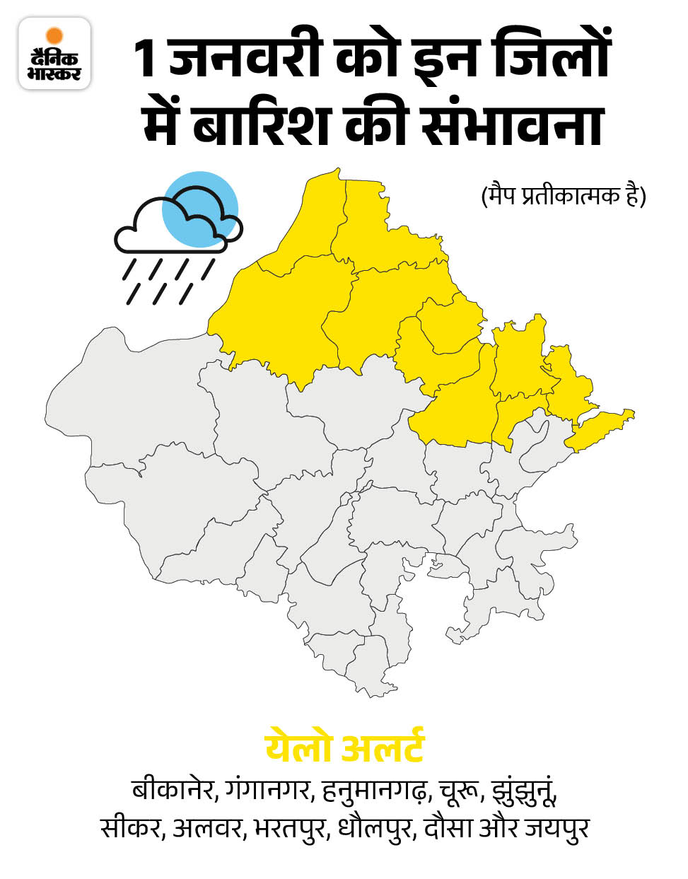 11 जिलों में बारिश हो सकती है। इसके साथ 1 जनवरी को भी राज्य में घना कोहरा पड़ने की संभावना है। मौसम केन्द्र जयपुर के निदेशक राधेश्याम शर्मा ने बताया- एक स्ट्रॉन्ग सिस्टम (पश्चिमी विक्षोभ) एक्टिव होने की संभावना है।