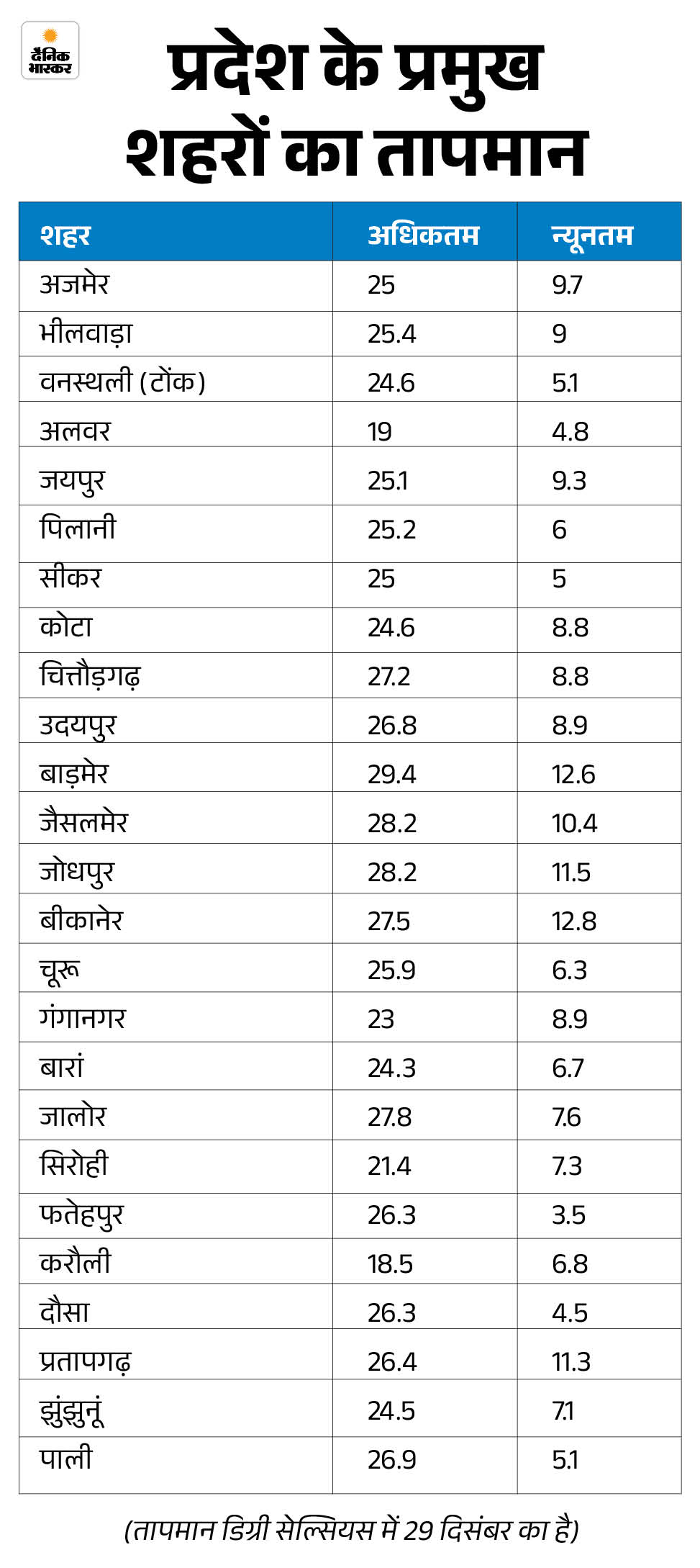 अलवर, हनुमानगढ़, करौली में दिन का अधिकतम तापमान 20 डिग्री सेल्सियस से भी नीचे दर्ज हुआ। सबसे ठंडा दिन करौली में रहा, जहां का अधिकतम तापमान 18.5 डिग्री सेल्सियस दर्ज हुआ।