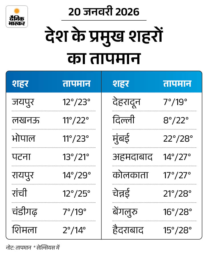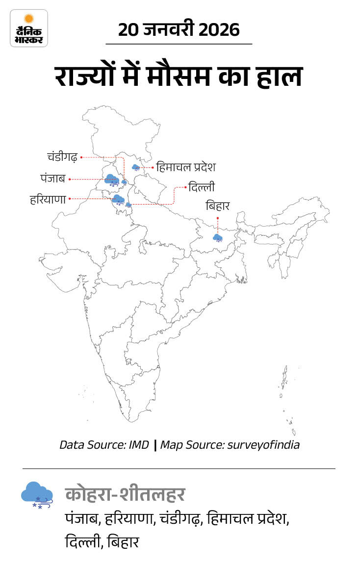 प्रदेश के ऊपर दो सिस्टम है। वेस्टर्न डिस्टरबेंस (पश्चिमी विक्षोभ) और साइक्लोनिक सर्कुलेशन की वजह से कई जिलों में बादल छा रहे हैं। वहीं, 21 जनवरी को स्ट्रॉन्ग वेस्टर्न डिस्टरबेंस उत्तर-पश्चिमी भारत को प्रभावित कर सकता है। पढ़ें पूरी खबर…